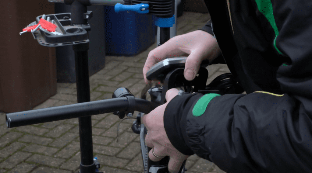 Next, we’ll be fixing the screen. To do this, we’ll need to loosen the fixing bolts with an allen key and attach the screen to the center of the handlebars. We then attach the brake cables to the new brake levers and run the new shift cable housing down the bike, threading the new cable through the housing and attaching it to the derailleur.